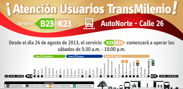 El horario establecido para este servicio los días sábado, será de 5:30 a.m. hasta las 10:00 p.m. y será ofrecido con buses biarticulados con los que se cubrirá la ruta, la cual cuenta con 15 puntos de parada ubicadas a lo largo de la calle 26, la caracas y la autopista norte. Este servicio operará inicialmente con una oferta promedio de 10 buses/hora por sentido los sábados. El servicio K23 ? B23 tiene la capacidad de movilizar alrededor de 40.000 usuarios diariamente para lo cual el Sistema TransMilenio programa para un sábado 150 despachos del servicio K23 y 150 despachos para el servicio B23, aproximadamente. La oferta será ajustada de acuerdo con la evolución de la demanda.