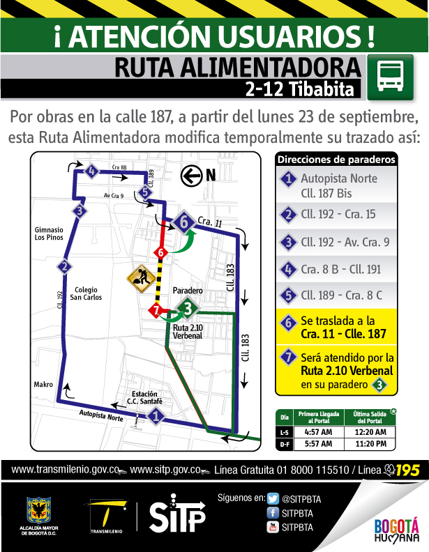 La ruta 2-12 Tibabita, modificará temporalmente su trazado debido a obras de mantenimiento que se realizarán en la calle 187, a partir del próximo lunes 23 de septiembre.