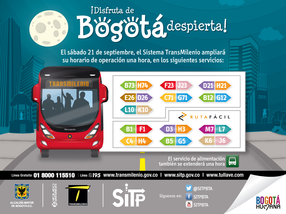 Para facilitar la movilidad de los usuarios durante la jornada de Bogotá Despierta, el próximo sábado 21 de septiembre de 2013, en vísperas de la celebración del Día del Amor y la Amistad, todos los servicios del Sistema TransMilenio, en su componente alimentación, troncal y zonal operarán una hora adicional, a su horario habitual.