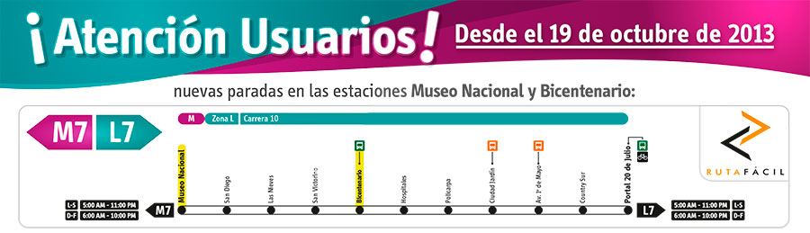 Este servicio troncal corresponde al corredor de la Carrera 10. La ruta M7-L7 inicia operación en el Portal 20 de Julio y finalizará en la Estación Museo Nacional.