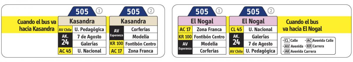 Esta ruta inicia operación en la zona de Fontibón - Kasandra y termina en El Nogal. Para este recorrido, se cuenta con 28 buses adecuados tecnológicamente para su funcionamiento. A lo largo de la ruta están fijados 136 paraderos con toda la información que el usuario requiere, para utilizar adecuadamente el servicio. Con esta ruta se estima beneficiar a 2.700 usuarios diarios y 290 pasajeros Hora picoPalabra con contexto: Intervalo de tiempo en el que se presenta el mayor número de pasajeros en el sistema de transporte en un intervalo de un día., correspondientes a los siguientes barrios:
