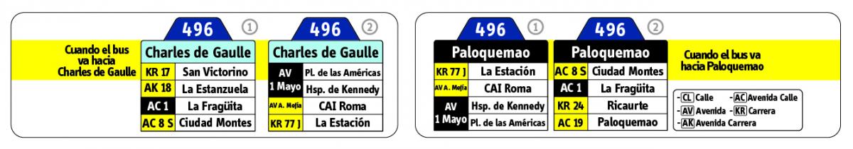 RUTA 496: tendrá dos buses pedagógicos. Un bus saldrá del Barrio Charles de Gaulle (Bosa) y el otro bus saldrá de Paloquemao, en el centro de la ciudad. Cada uno con dos orientadores del SITP. Esta ruta pedagógica operará en el horario de 6:00 a.m. a 6:00 p.m.