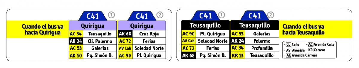 C41: esta ruta será cubierta con un bus pedagógico que saldrá de Quirigua y otro cuyo inicio es en Teusaquillo. Cada uno de estos buses con dos orientadores del SITP, operará en el horario de 6:00 a.m. a 6:00 p.m.