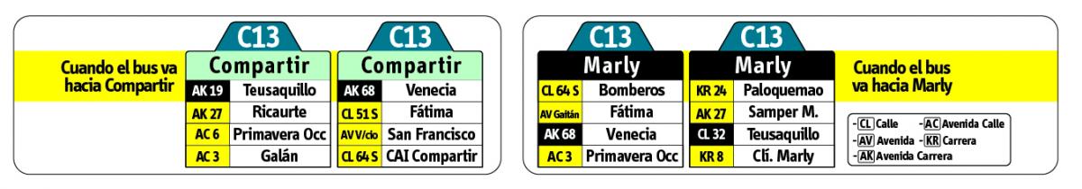 C13: de igual manera tendrá dos buses pedagógicos. Un bus saldrá del CAI Compartir, en el barrio San Francisco en Ciudad Bolívar y contará con tres orientadores del SITP. Esta ruta pedagógica operará en el horario de 6:00 a.m. a 6:00 p.m.
