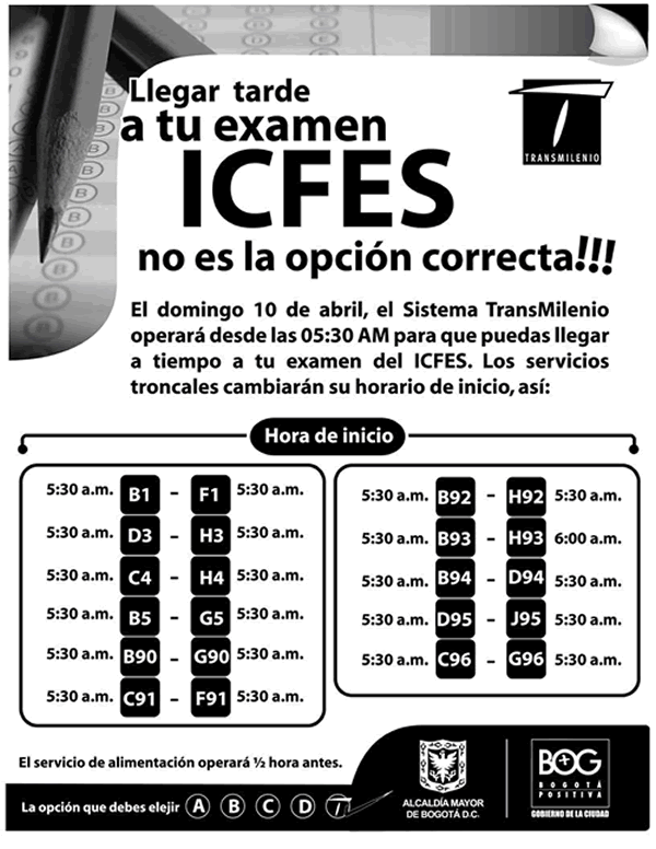 Con el objetivo de contribuir con el desplazamiento oportuno de los estudiantes de la Capital, para presentar las Pruebas del ICFES, el próximo domingo 10 de ABRIL de 2011, el Sistema TransMilenio operará TODOS los servicios habitúales de día festivo desde las 05:30 a.m.