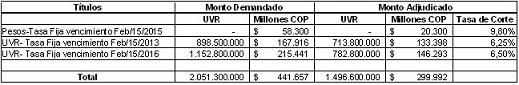 En efecto, los títulos en Pesos-Tasa Fija vencimiento Feb/15/2015 ($20.300 millones) se colocaron efectivamente a 76 Pbs por encima de los TES en pesos (Margen promedio entre TES referencia de Octubre de 2015 y Mayo 2014),los títulos en UVR- Tasa Fija vencimiento Feb/15/2013 ($133,398 millones) se colocaron a 120 Pbs por arriba de los TES UVR (20 marzo de 2013) y finalmente los títulos en UVR- Tasa Fija vencimiento Feb/15/2016 ($146,293) se asignaron a 90 Pbs por arriba de los TES UVR (25 febrero de 2015). Los spread máximos esperados en cada referencia, que fueron establecidos como tasas máximas y que permanecieron ocultos durante la subasta, estuvieron en todos los casos por encima.