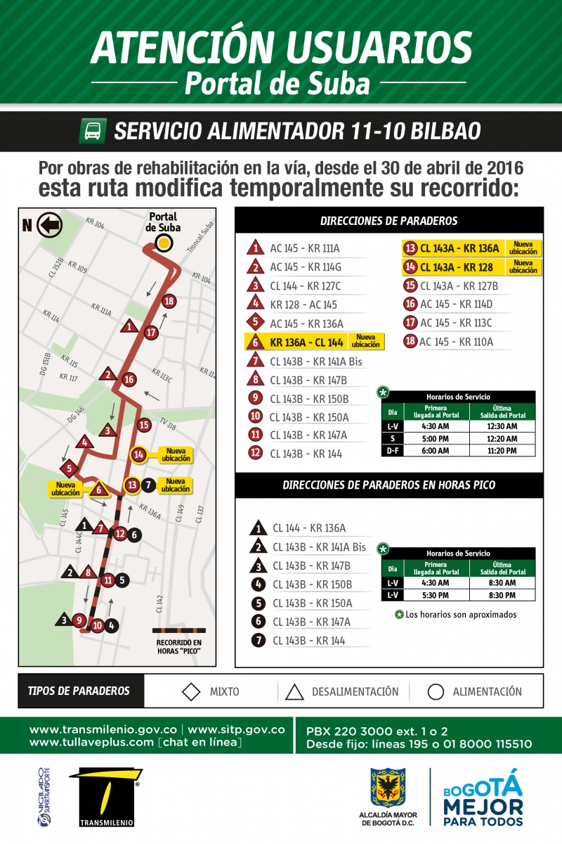 Por obras de rehabilitación en la vía, desde el 30 de abril de 2016, la ruta alimentadora 11-10 Bilbao modifica temporalmente su recorrido, cambiando las paradas 6, 13 y 14 a las siguientes direcciones:
