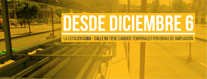 Por ampliación de la Estación Suba - Calle 95 se tendrán cambios en la operación desde el 6 de diciembre, los servicios C30 - G30 dejan de parar temporalmente en el punto y tendrán parada adicional en las estaciones San Martín y Suba Calle 100.