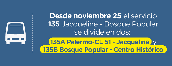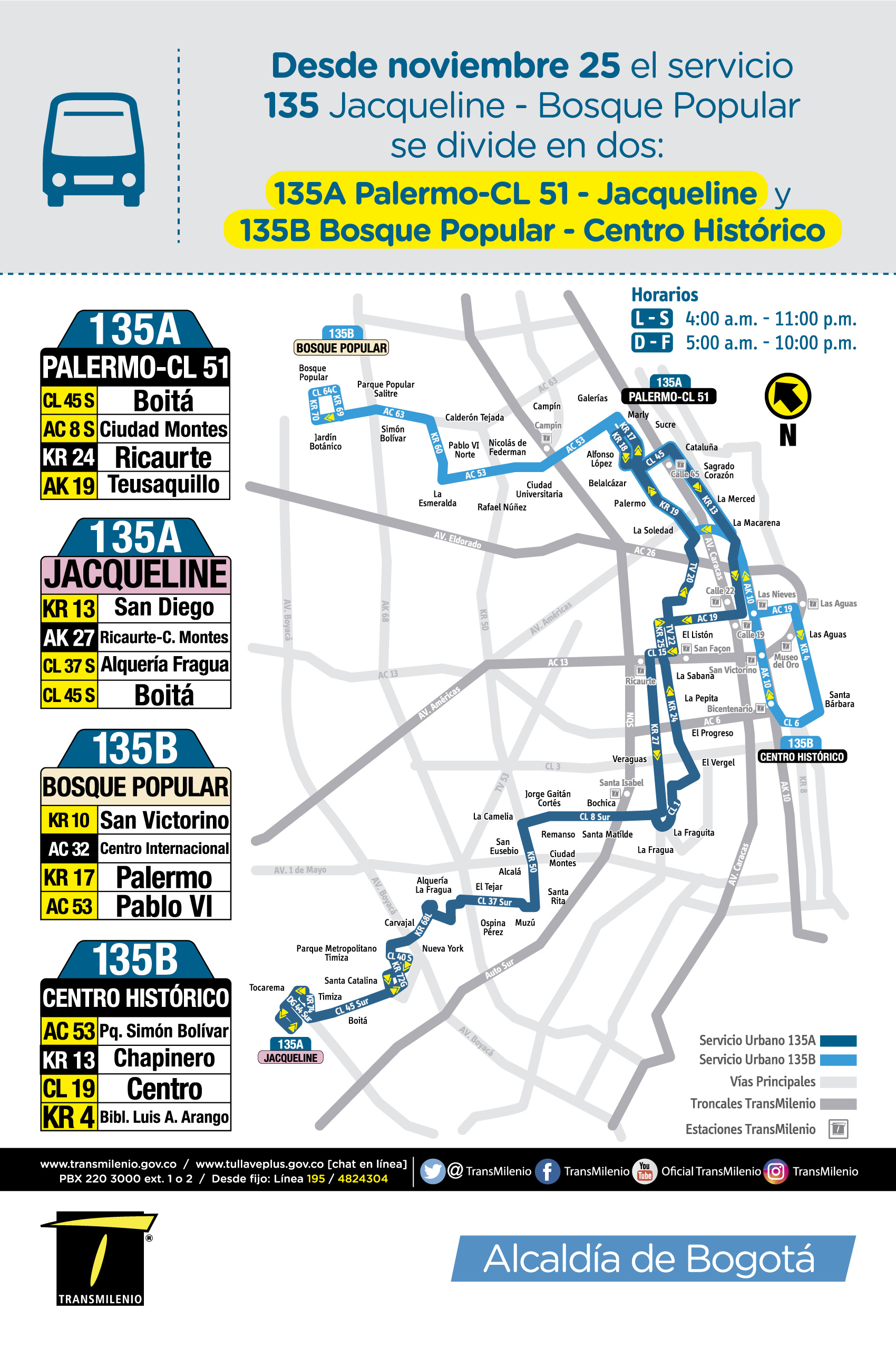 Desde el 25 de noviembre, la ruta 135 del SITP se dividió en dos pensando en los diferentes usuarios del sistema. De ahora en adelante los servicios se encuentran de la siguiente manera:
