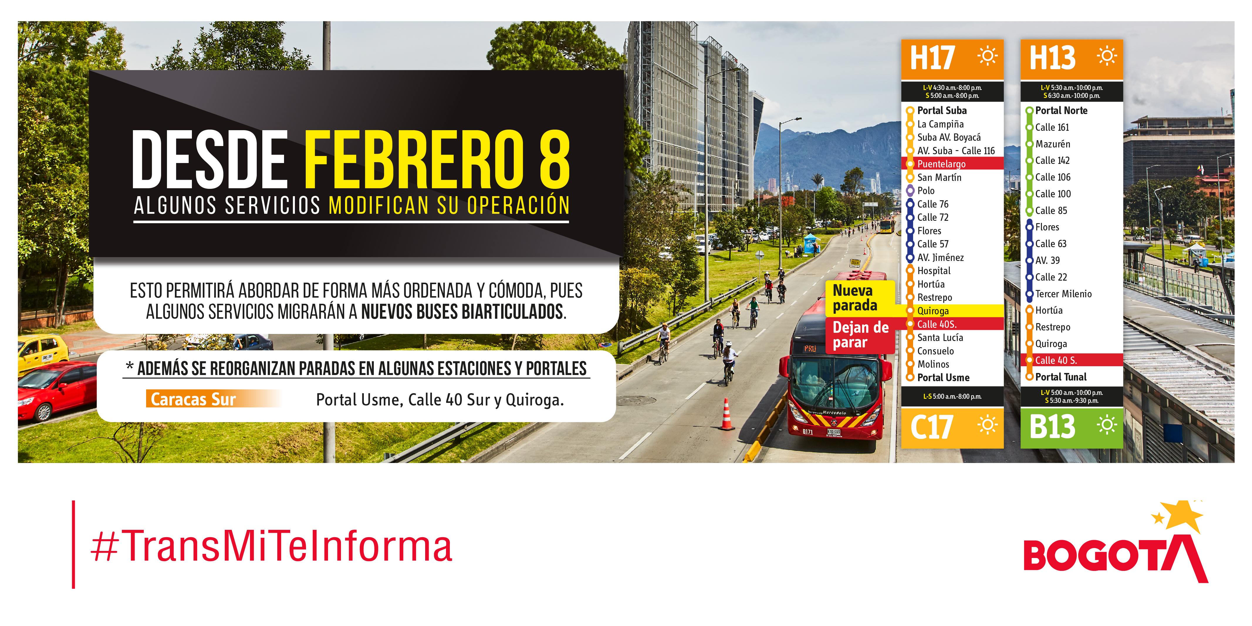 Desde este sábado 8 de febrero la ruta H17 dejará de parar en las Estaciones Puente Largo y Calle 40 Sur y adicionará una parada en la estación Quiroga, así mismo la ruta H13 no operará la Calle 40 Sur.