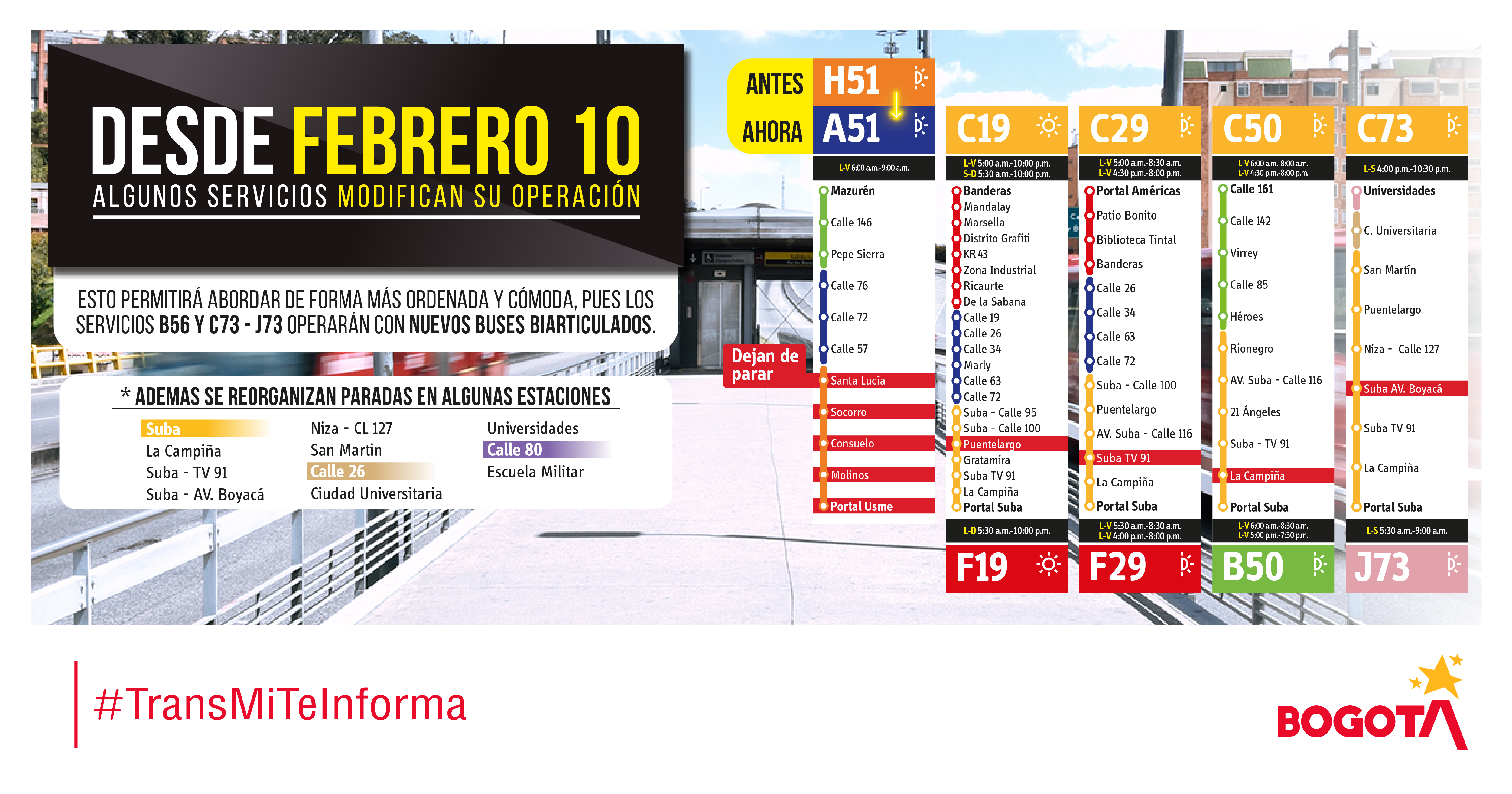 Para el lunes 10 de febrero la ruta H51 pasará a denominarse A51 y dejará de operar las estaciones Santa Lucía, Socorro, Consuelo, Molinos y Portal Usme. Y los siguientes servicios dejarán de operar algunas estaciones de la siguiente manera: