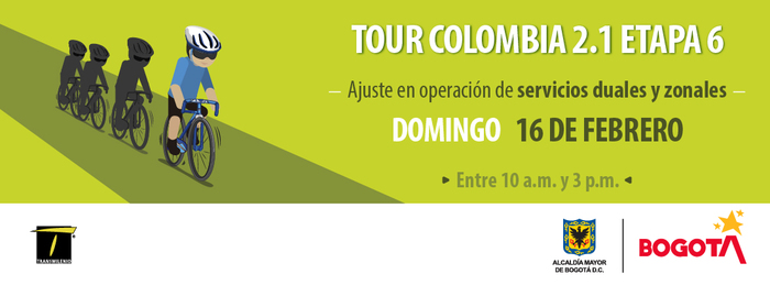 Este domingo 16 de febrero se realizará el Tour Colombia 2.1 etapa 6, por este motivo las rutas duales y zonales que transitan por la carrera séptima, tendrán modificaciones entre las 10 a.m. y las 3 p.m.