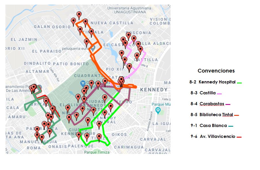 - 8-4 (Corabastos), 8-2 (Kennedy Hospital), 9-6 (Av Villavicencio) y 9-1 (Casablanca) – servicios con paraderos en la zona de alerta.