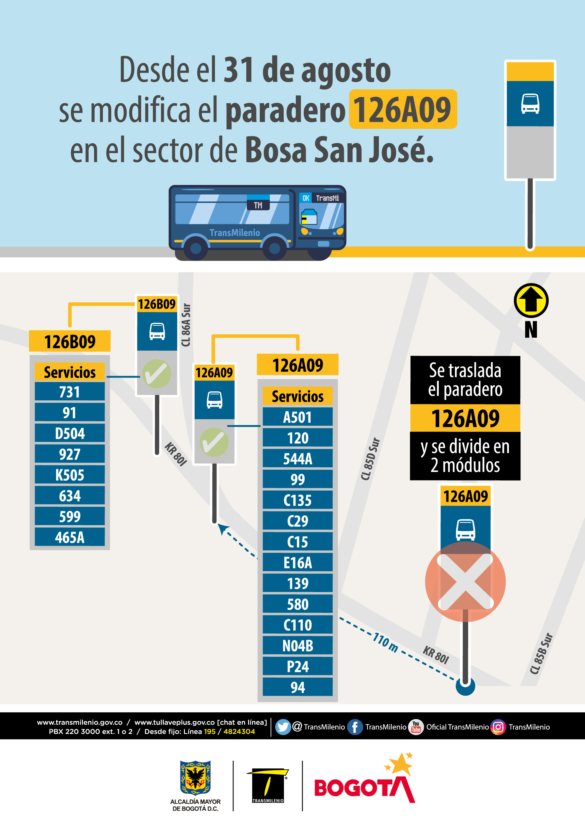 A partir del 31 de agosto, tendremos dos cambios uno para el paradero 126A09 que se encuentra en el sector de Bosa San josé que ahora se divide en dos módulos 126A09 y 126B09, por el alto transito de rutas en el sector. Adicional la ruta provisional 19-10 Calle 129 modifica su operación a la altura de la Calle 134 con carrera 59 por obras en el punto.