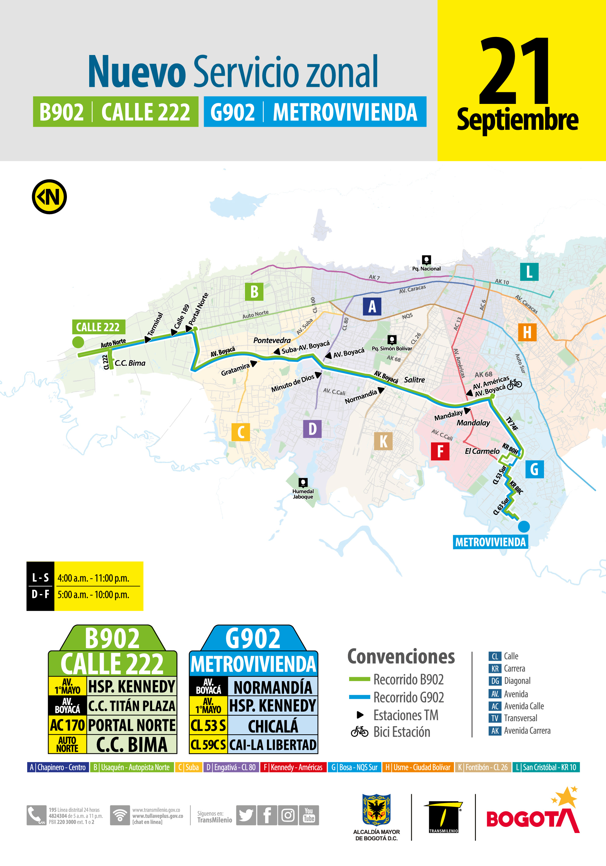 Desde este 21 de septiembre, los usuarios del sistema zonal que se movilizan desde el sur hasta el norte de la ciudad, se verán beneficiados con el ingreso de la nueva ruta B902 Calle 222 – G902 Metrovivienda. La nueva ruta que durante su recorrido se desplazará en gran medida por la Av. Boyacá, pasará también por puntos como el Hospital de Kennedy, C.C. Titán Plaza y terminará su recorrido hacía el norte en el C.C. Bima.