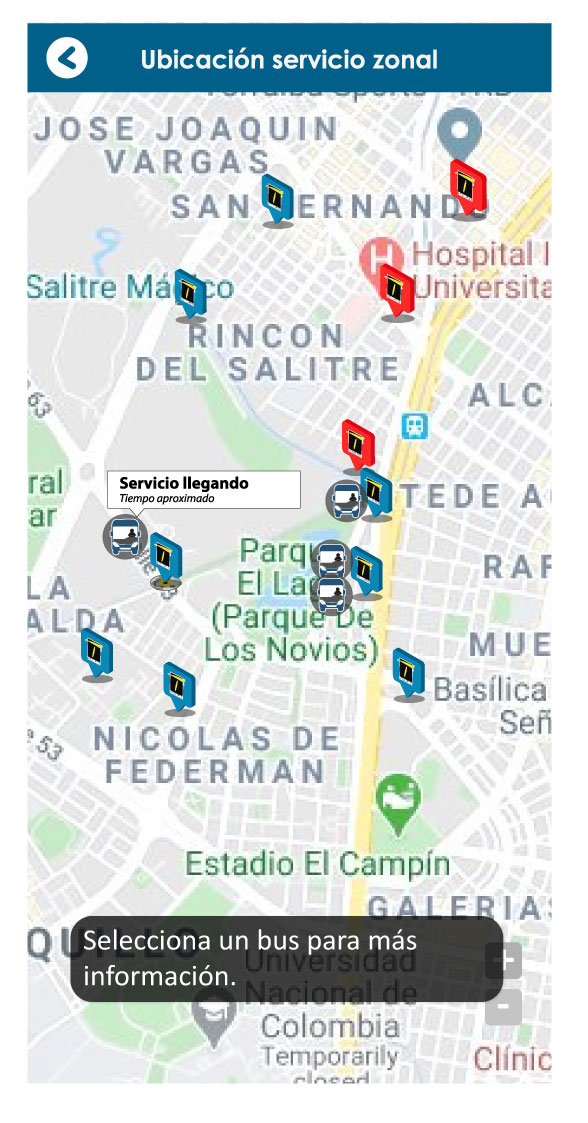 Según la ubicación del usuario, le muestra la estación o paradero zonal más cercano, a menos de 5 minutos de distancia caminando.