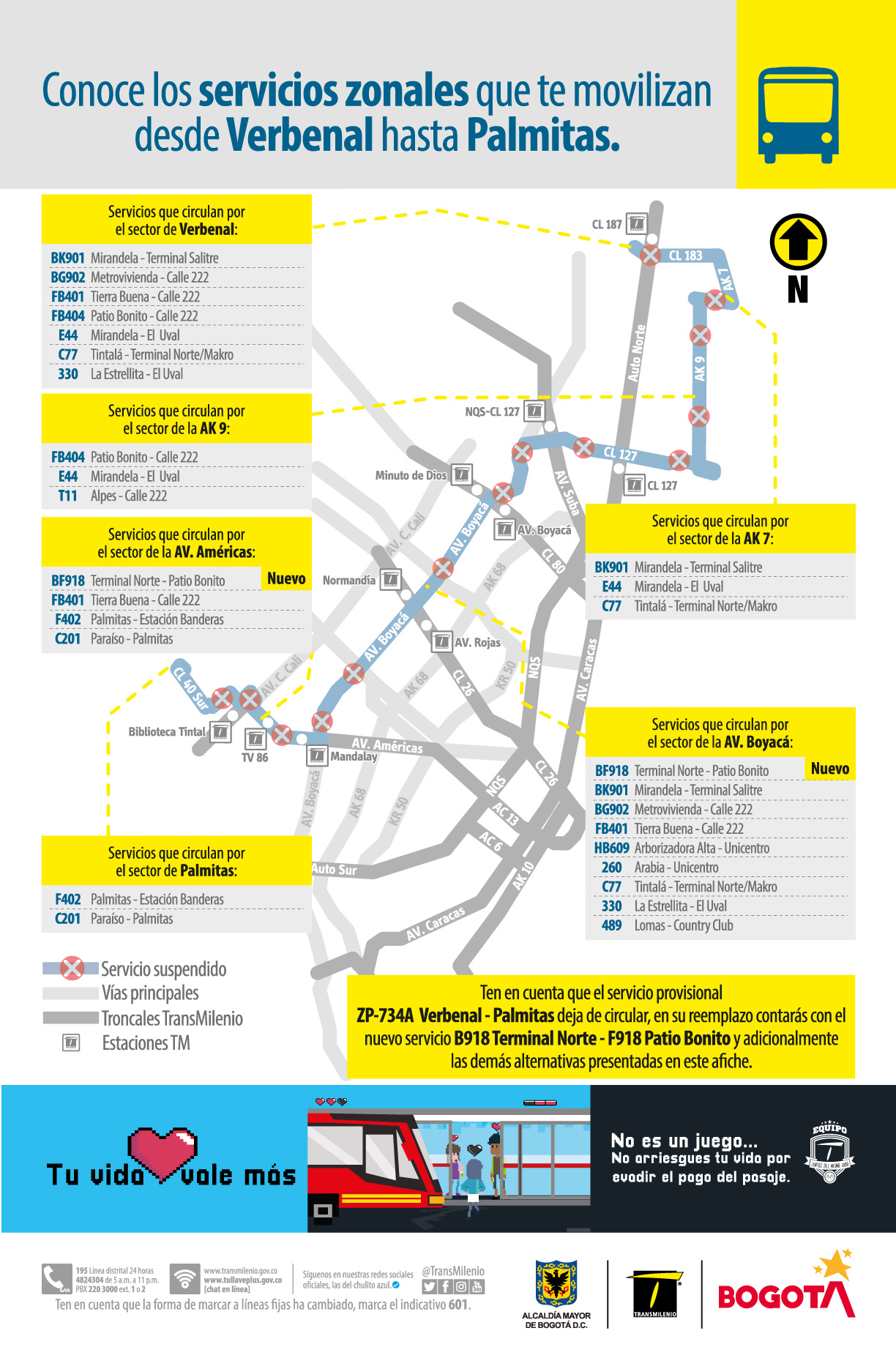 La ruta B918 Terminal Norte – F918 Patio Bonito cubre parte de estos sectores desde la Avenida Boyacá hasta Palmitas y con los demás servicios mencionados y las conexiones que ofrecen -dependiendo del origen y el destino del viaje-, el Sistema garantiza la cobertura de transporte para todas las personas que usaban la ruta ZP-734A Verbenal – Palmitas que dejó de operar.