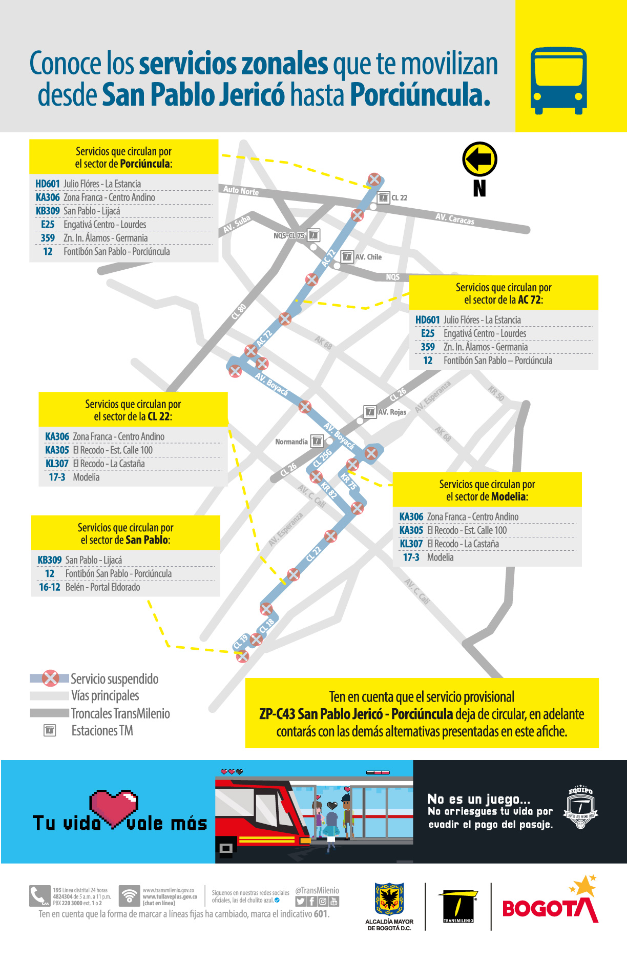 El Sistema TransMilenio tiene un portafolio de rutas para los usuarios y usuarias que se movilizan entre San Pablo Jericó en la localidad de Fontibón y Porciúncula en Chapinero. Con ellas, se podrán conectar a todos los componentes del Sistema a través de la tarjeta tullave.
