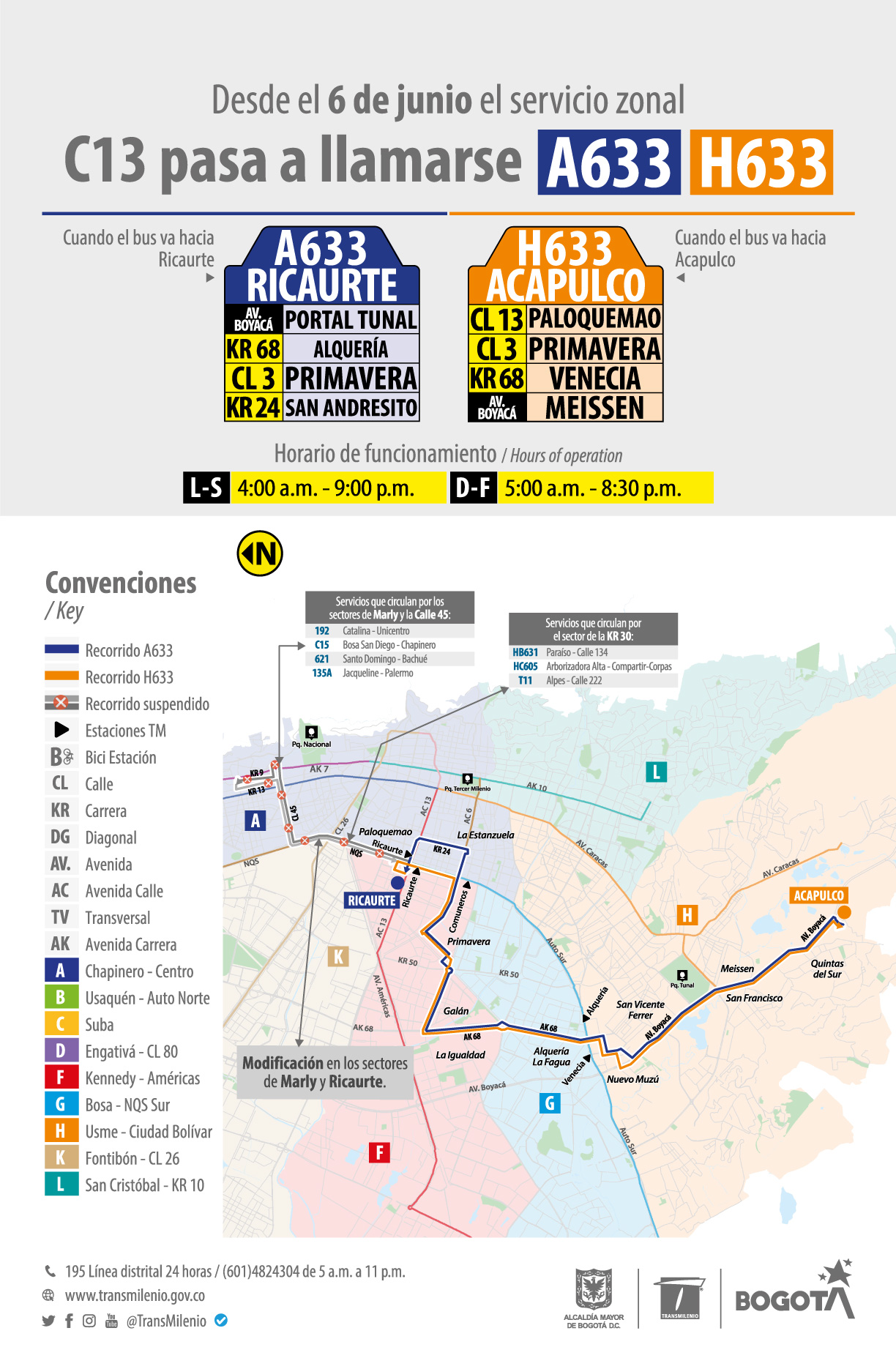 Desde el próximo lunes 6 de junio la ruta zonal C13 pasará a llamarse A633 Ricaurte - H633 Acapulco y tendrá un ajuste en su recorrido, facilitando la conexión con la estación de Ricaurte.