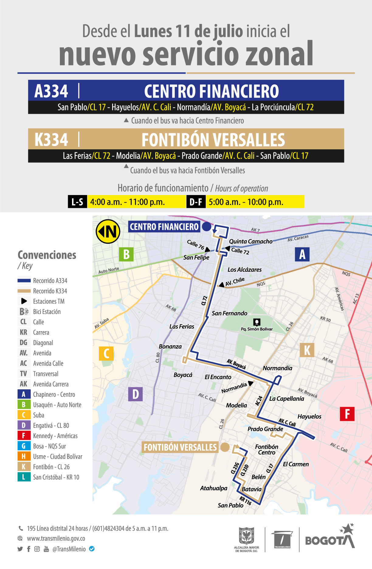 Desde el próximo lunes 11 de julio los usuarios y usuarias podrán usar la nueva ruta zonal A334 Centro Financiero – K334 Fontibón Versalles. Esta ruta operará de lunes a sábado de 4 de la mañana a 11 de la noche y los domingos y festivos de 5 de la mañana a 10 de la noche.