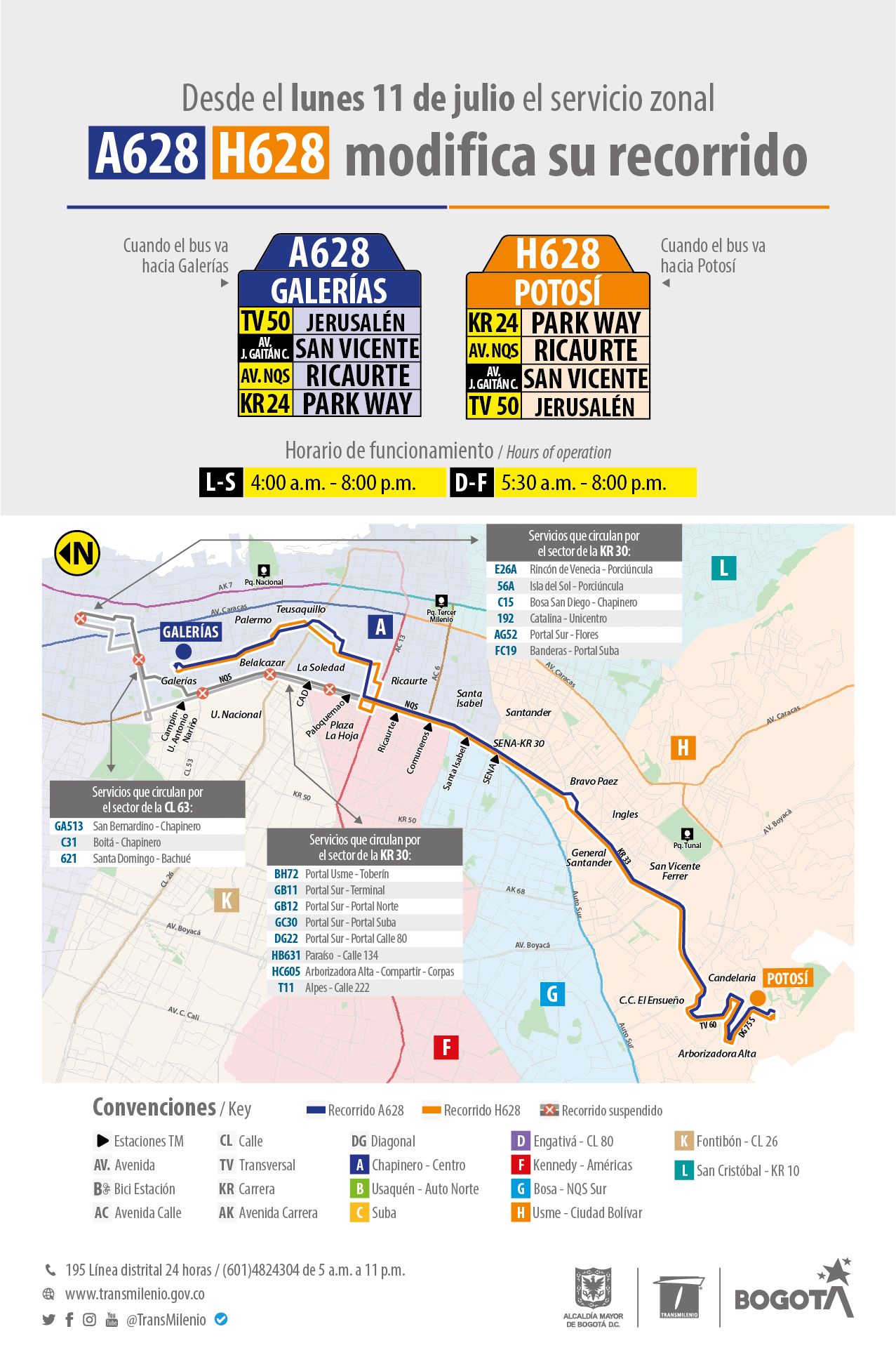 Desde el próximo lunes 11 de julio el servicio zonal A628 Galerías – H628 Potosí ajustará su recorrido tomando la carrera 24 para llegar a Galerías. El servicio seguirá operando lunes a sábado de 4 de la mañana a 8 de la noche y los domingos y festivos de 5:30 de la mañana a 8 de la noche.