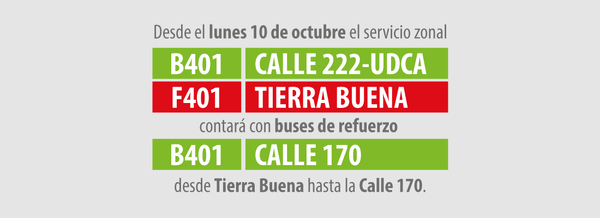 Desde el próximo lunes 10 de octubre de 2022, la ruta zonal B401 Calle 222 – UDCA – F401 Tierra Buena, contará con buses de refuerzo que conectan Tierra Buena con la Calle 170 y los podrán identificar como B401 Calle 170. El horario de operación de este servicio de refuerzo será de lunes a viernes de 4 de la mañana a las 11 de la noche.