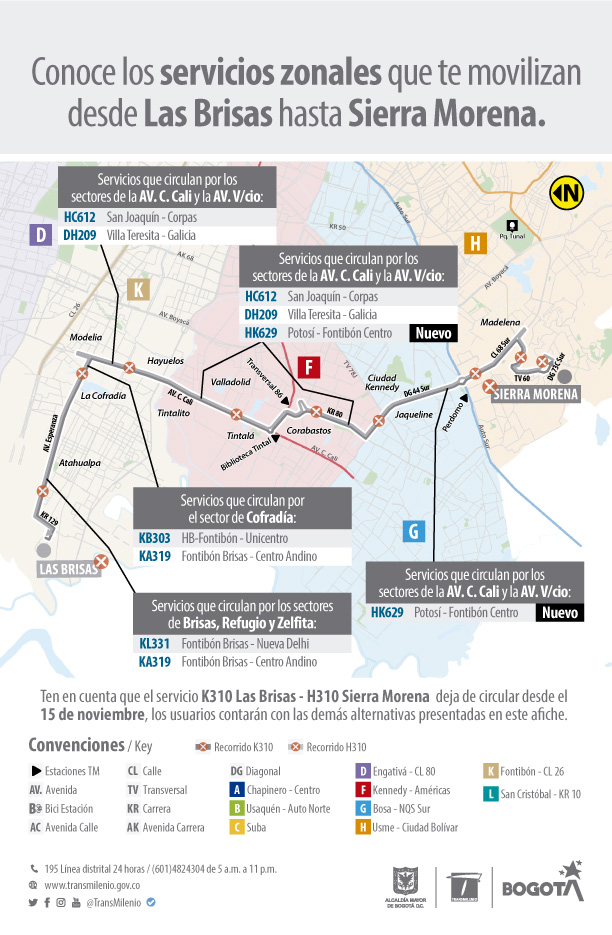 - Por los sectores de la Av. Ciudad de Cali y la Av. Villavicencio: H612 San Joaquin – C612Corpas, D209 Villa Teresita – H209 Galicia y H629 Potosí – K629 Fontibón Centro