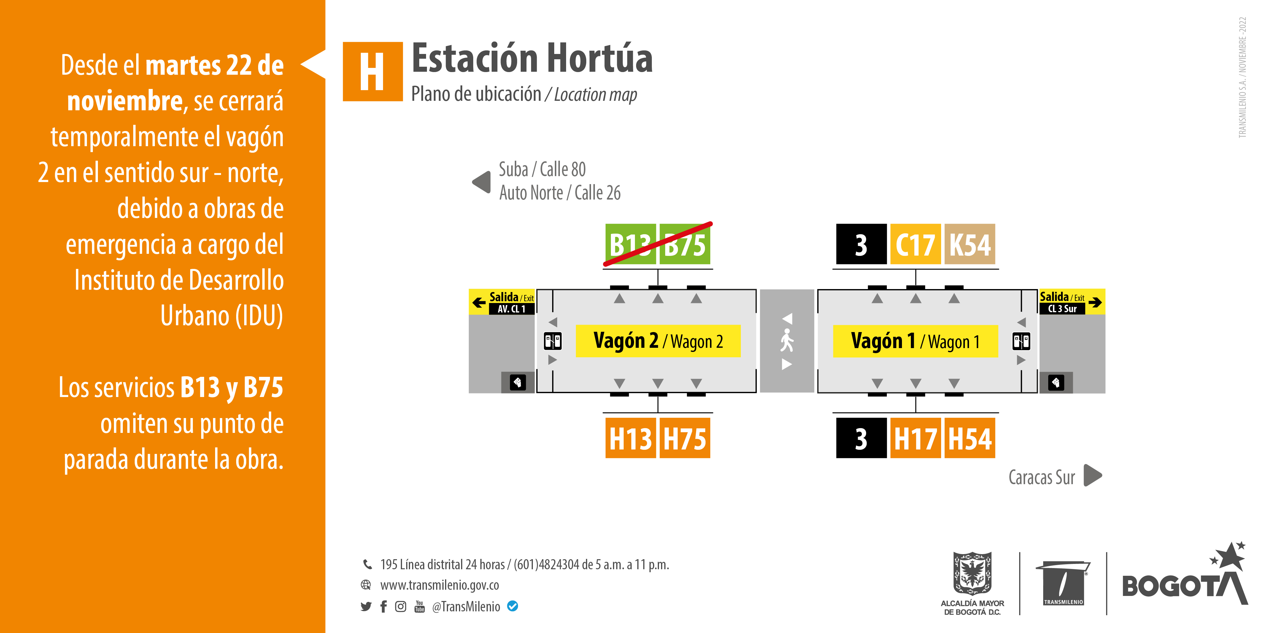 Desde el martes 22 de noviembre, la estación Hortúa de la Troncal Caracas Sur, presentará cierre temporal en sentido sur-norte debido a obras que desarrollará al Instituto de Desarrollo Urbano (IDU). Por este motivo, los servicios B13 y B75 omitirán la parada en esta estación.