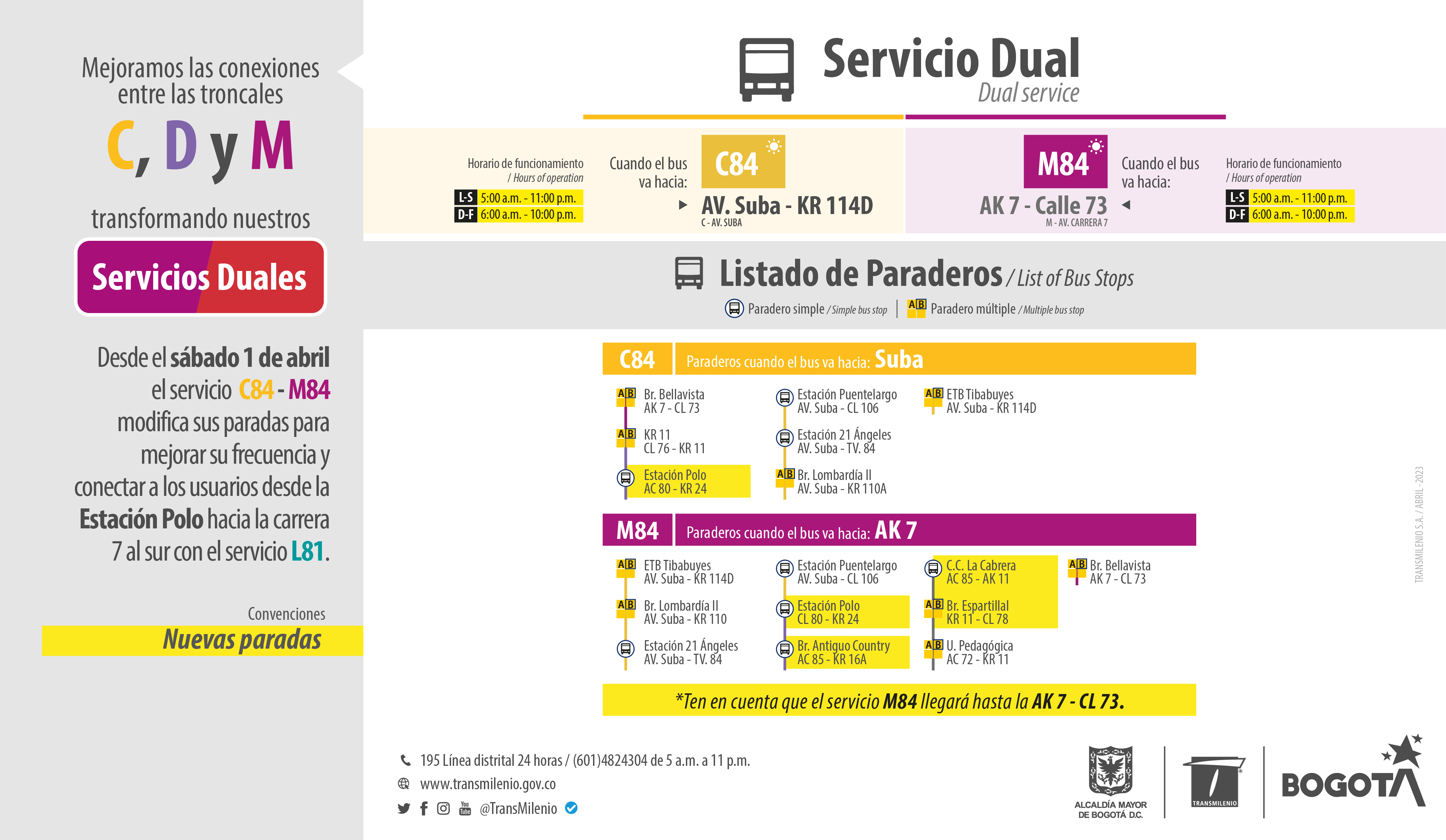 - Por último, el servicio C84 - M84 modifica su recorrido llegando ahora hasta la Calle 72, ampliando su cobertura sobre la Calle 85 y la Carrera 11, y mejorando su frecuencia para facilitar la conexión de los habitantes de Suba con la Carrera 7 con Calle 72. El horario de funcionamiento de esta ruta es de lunes a sábado de 5:00 de la mañana a 11:00 de la noche y los domingos y festivos 6:00 de la mañana a 10:00 de la noche.