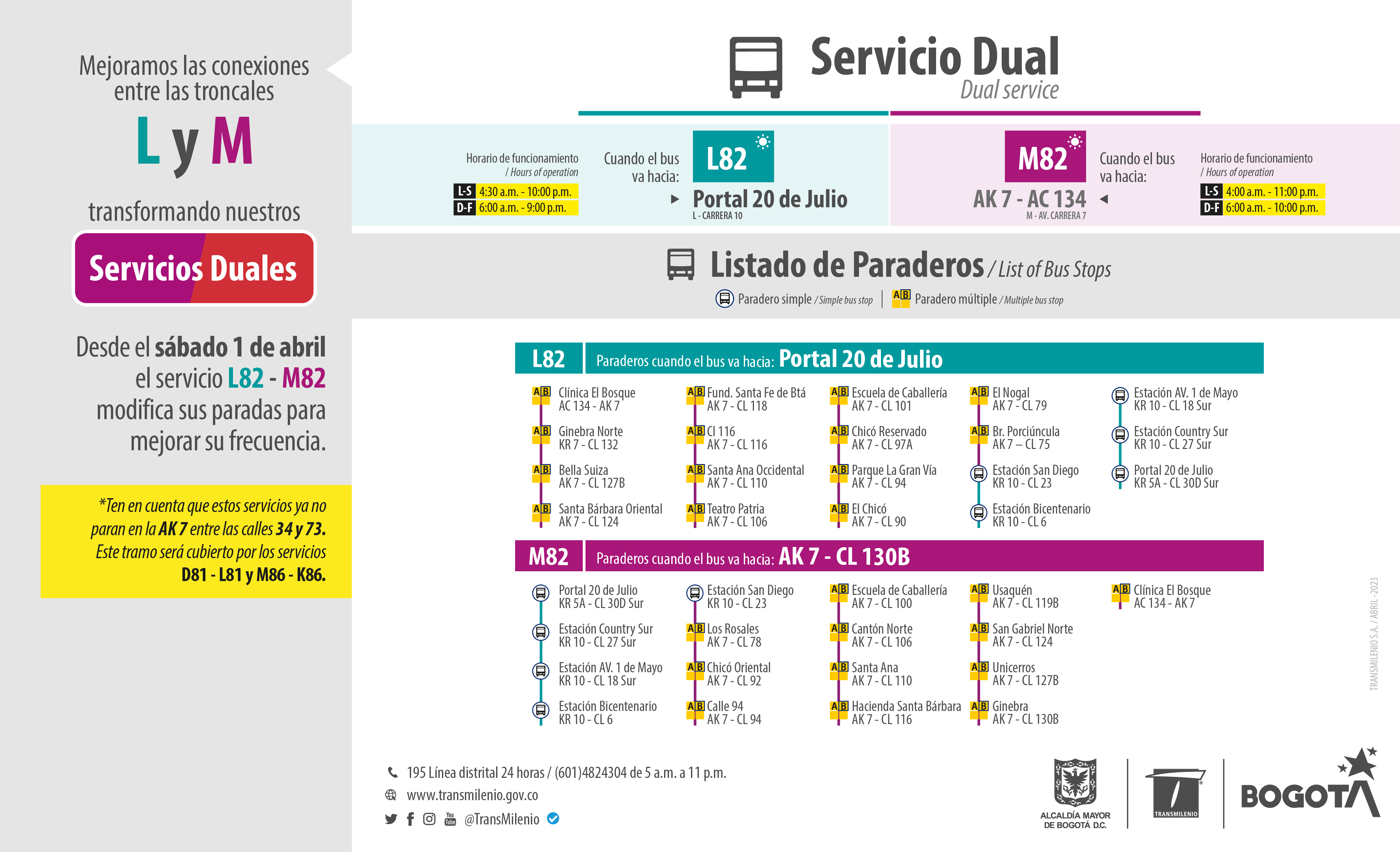 De esta manera, con estos cambios, el D81 - L81 reforzará la operación del servicio dual desde el Portal 20 de Julio hacia la Carrera 7 (desde Calle 26 a la Calle 73) y el servicio M82 - L82 atenderá específicamente el tramo Norte del corredor (Calle 75 a Calle 134).