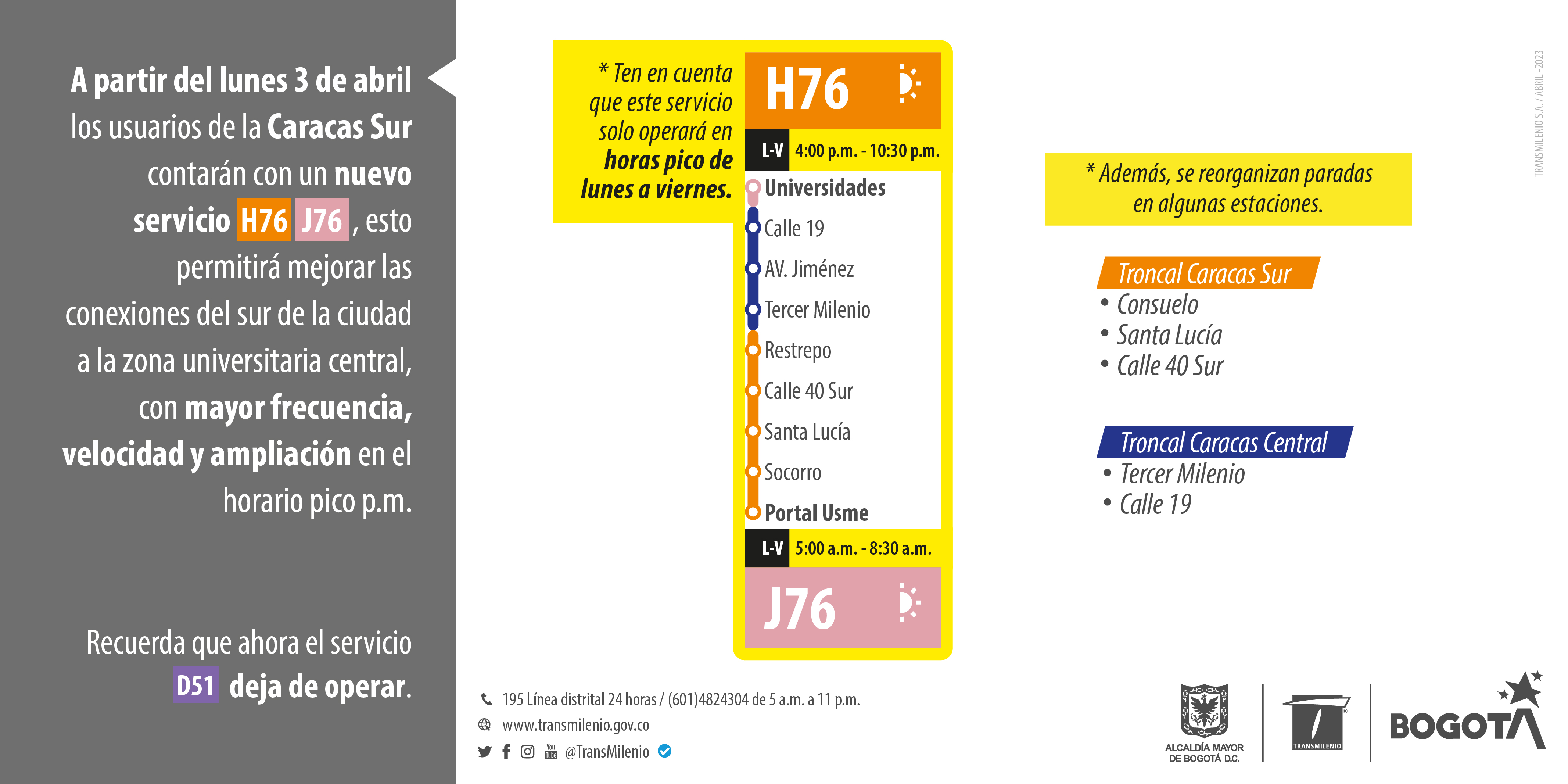 A partir del lunes 3 de abril los usuarios de la Caracas Sur contarán con el nuevo servicio H76 - J76 que irá desde el Portal Usme, hasta Universidades, estó permitirá mejorar conexiones del sur de la ciudad a la zona universitaria central, con mayor frecuencia, velocidad y ampliación en horarios pico p.m.