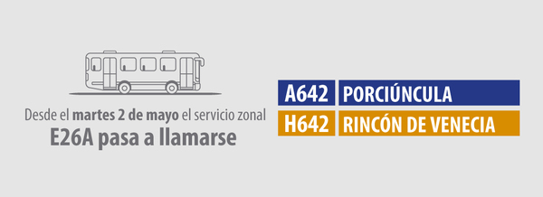 A partir del 2 de mayo la ruta zonal E26A pasa a llamarse A642 Porciúncula - H642 Rincón de Venecia. Este servicio también modificará su recorrido en los sectores de Kennedy y Timiza, transitando sobre la Avenida Boyacá desde la Avenida Primera de Mayo.
