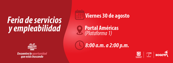 TRANSMILENIO S.A. invita a nuestra comunidad usuaria a participar en la tercera feria de servicios y empleabilidad de este año, con más de 300 vacantes disponibles, que se realizará este viernes 30 de agosto en la plataforma 1 del Portal Américas, con un horario de atención de 8:00 a.m. a 2:00 p.m.