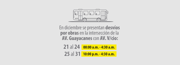 Del 21 al 24 de diciembre desde las 12:00 a.m. a 4:30 a.m. y del 25 al 31 de diciembre de 10:00 p.m. a 4:30 a.m., diversos servicios TransMiZonales desviarán por obra en la vía entre las calles 42A Sur y Calle 49 Sur con Avenida Guayacanes. Estas rutas, tomarán la calles 42A sur, Avenida Villavicencio, Avenida Cali y Calle 49 sur para seguir su recorrido con normalidad