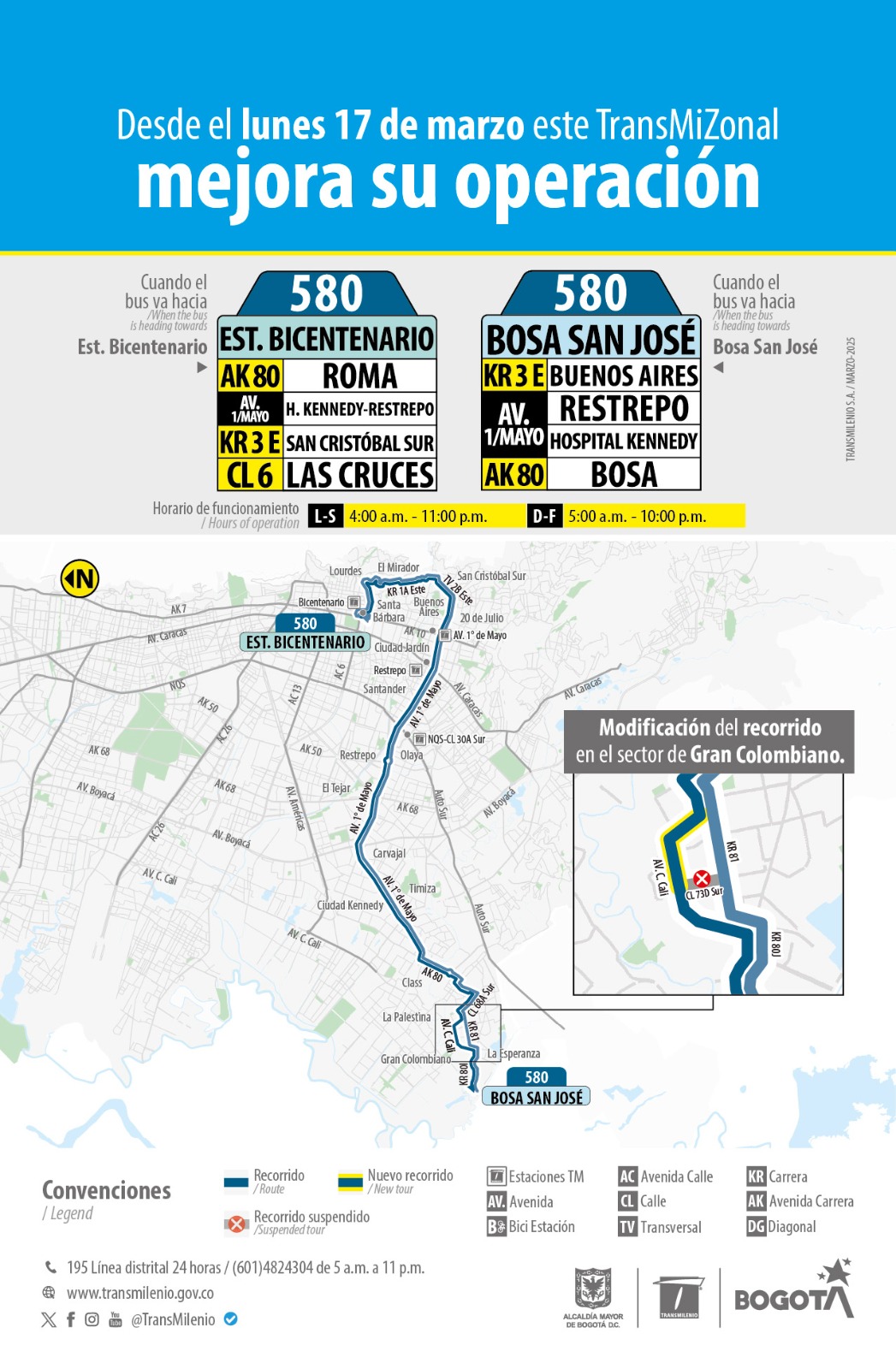 A partir del 17 de marzo, el servicio 580 Estación Bicentenario modifica su recorrido en el sector de Gran Colombiano en la localidad de Bosa. Este servicio ahora tomará la Avenida Ciudad de Cali por la carrera 81.