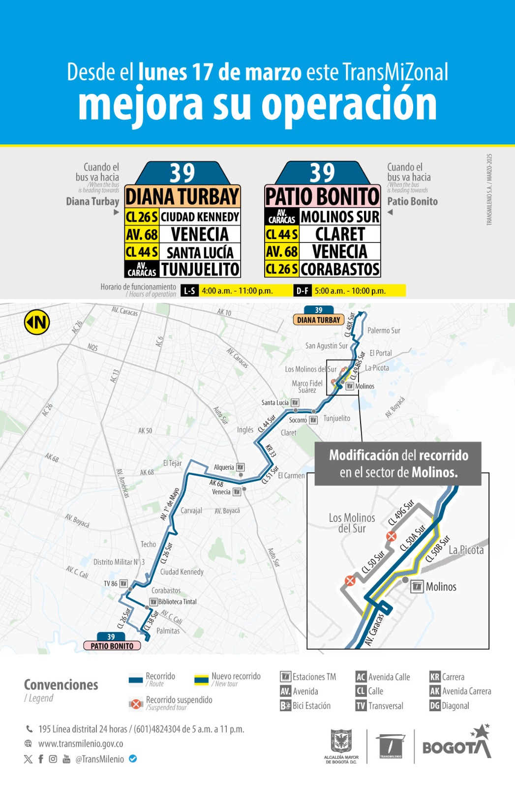 A partir del 17 de marzo, el servicio 39 Diana Turbay - Patio Bonito, modifica su recorrido en el sector de Molinos en la localidad de Usme - Ciudad Bolívar. Este servicioahora toma la calle 50A Sur, omitiendo el recorrido por la calle 50 Sur y calle 49G sur.