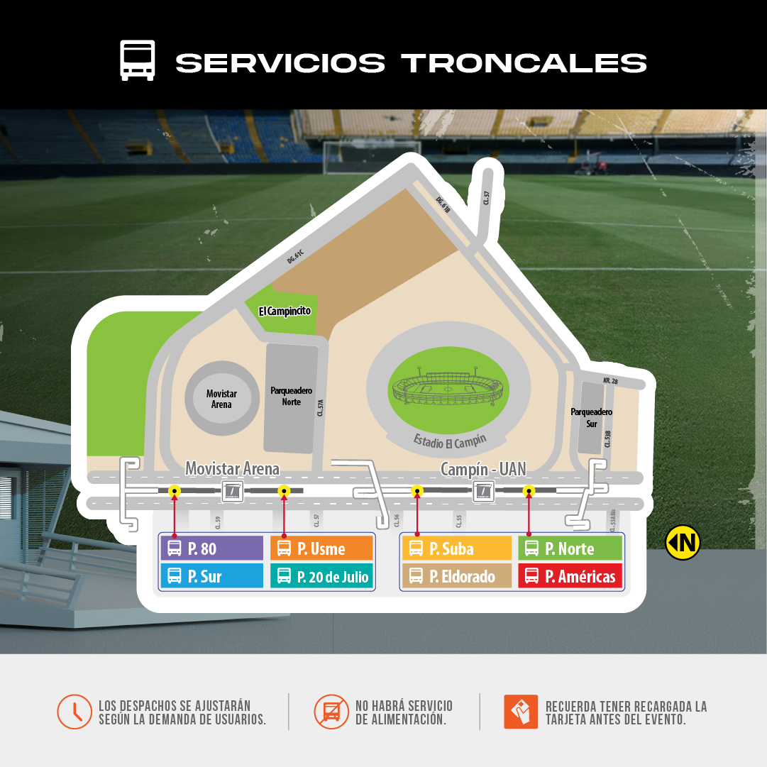 Para arribar al estadio, nuestra comunidad usuaria cuenta con 13 servicios troncales que paran en las estaciones Movistar Arena (4, B72, C25, C30, D21, G30, H21, H72 y L25) y Campín – UAN (4, B11, C25, D21, E42, G11, G42, H21 y L25) y 27 servicios de TransMiZonal con paraderos en la zona aledaña a El Campín (en la Avenida NQS, Calle 63 y Calle 53).