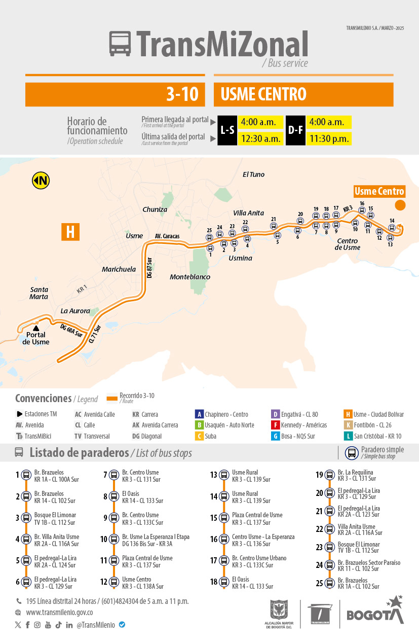 Desde el 21 de abril de 2025, el servicio 3-10 Usme Centro, tendra novedad en la Carrera 3 y calle 13B Sur en el paradero Centro Usme (093A12), omitiendo su parada.