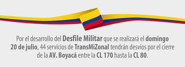 Comunidad Usuaria por el desarrollo del desfile Militar que se realizará el domingo 20 de julio, 44 servicios de TransMiZonal tendrán desvíos por el cierre de la Av. Boyacá entre la Calle 170 hasta la Calle 80.