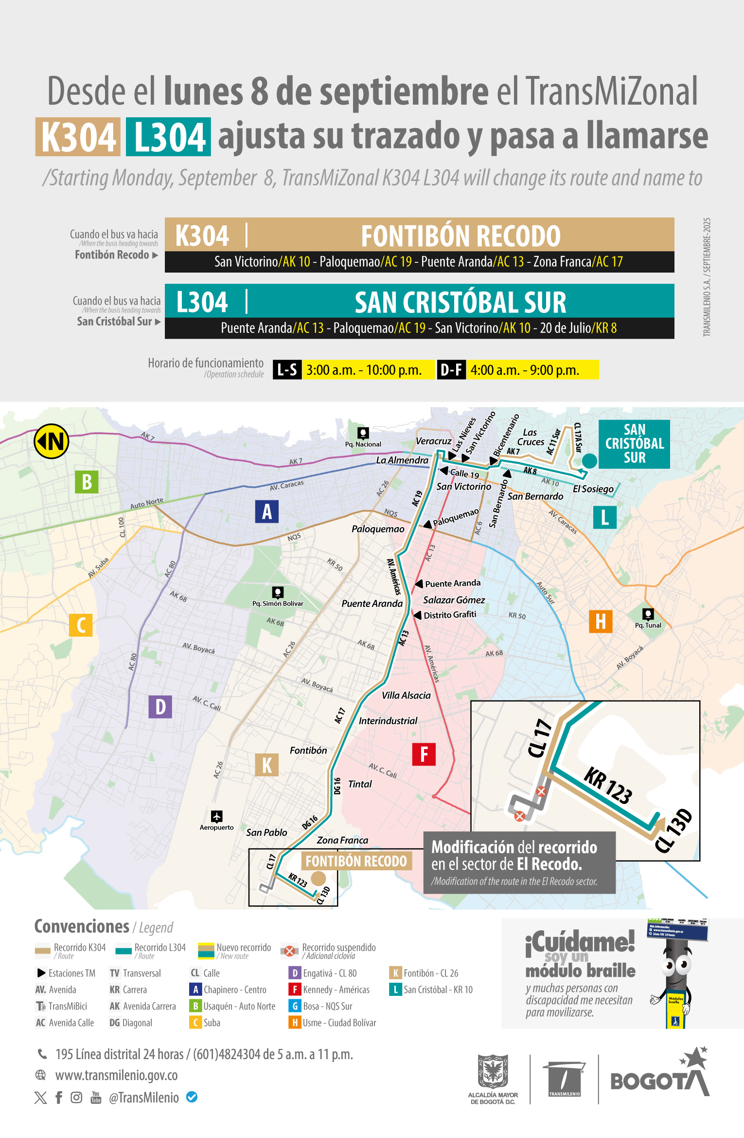 A partir del 8 de septiembre, el servicio TransMiZonal K304 Fontibón Recodo - L304 San Cristóbal Sur, modifica su recorrido en el sector de El Recodo dejando de pasar por un tramo de la calle 17 con carrera 123.