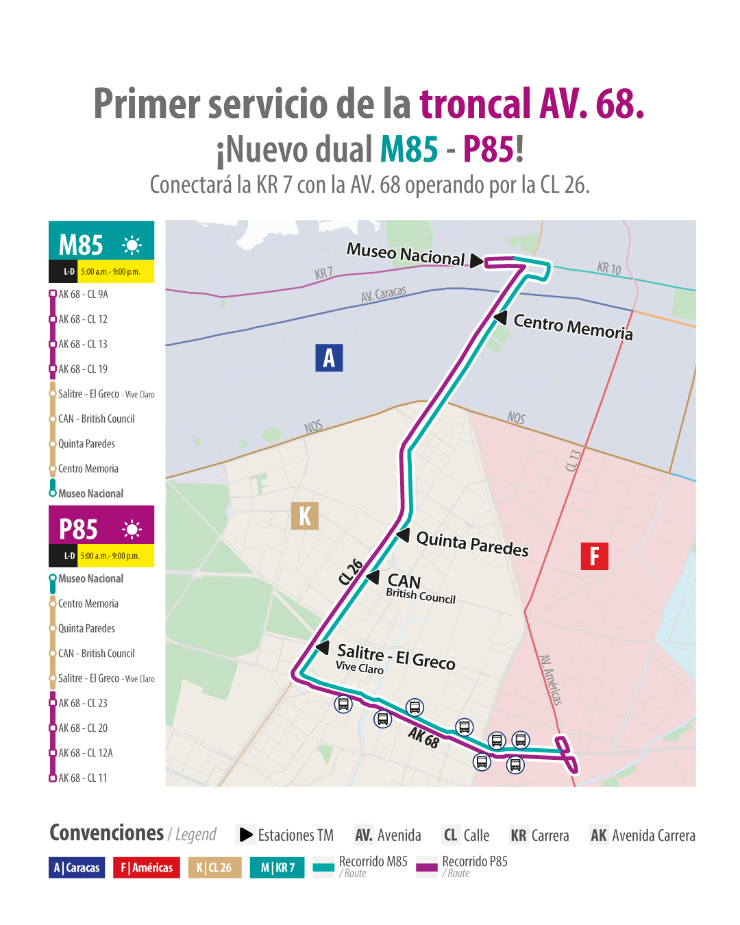 El servicio MP85 utilizará el puente vehicular exclusivo para TransMilenio que une la avenida 68 con la infraestructura de la troncal Calle 26. Este diseño permite la conexión directa desde el occidente de Bogotá, específicamente desde la avenida Las Américas con avenida 68, hasta la estación Museo Nacional ubicada en un punto estratégico del centro de la ciudad, facilitando la movilidad de los usuarios.